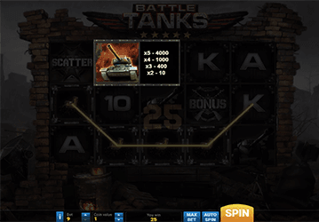 Решив играть бесплатно в слот-аппарат Battle Tanks вы окажетесь на полях танковых сражений второй мировой войны. На барабанах слот-машины появляются символы: артиллерийские орудия, скрещенные винтовки, грузовые автомобили, тяжелые танки и щиты с надписями ”bonus”, ”wild” и ”scatter”. Сражение происходит на фоне полуразрушенного города и озвучивается мрачной музыкой, в результате чего создается еще более эпичная атмосфера. Удачи в игре!
