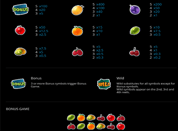 Демо прототип игрового аппарата Fruits Land позволяет геймерам почувствовать себя настоящим барменом, создающим фруктово-ягодные коктейли из сочных киви, сладких вишенок, спелых малин и яблок. Кроме этого, в розыгрышах слота участвуют особенные символы – таблички с надписями ”wild” и ”bonus”. Самым счастливым игрокам удастся запустить бесплатную дополнительную игру, главным призом в которой является 15 400 условных единиц.